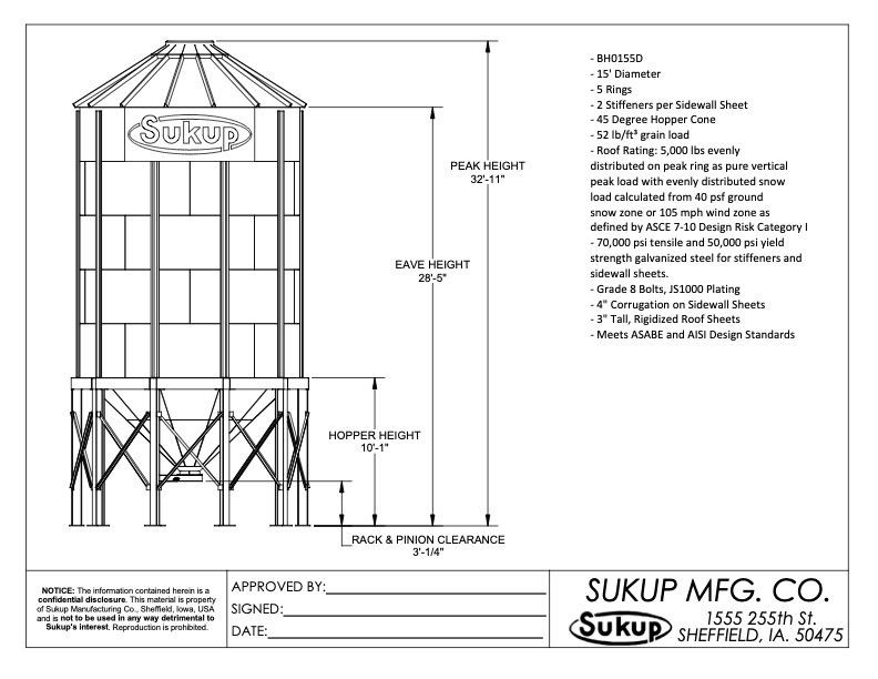 El silo está diseñado para soportar vientos de hasta 169 km/h y cargas de nieve distribuidas equivalentes a 2.268 kg en pico. Se arma sobre base de hormigón y está preparado para almacenaje de granos de flujo libre (hasta 833 kg/m³).