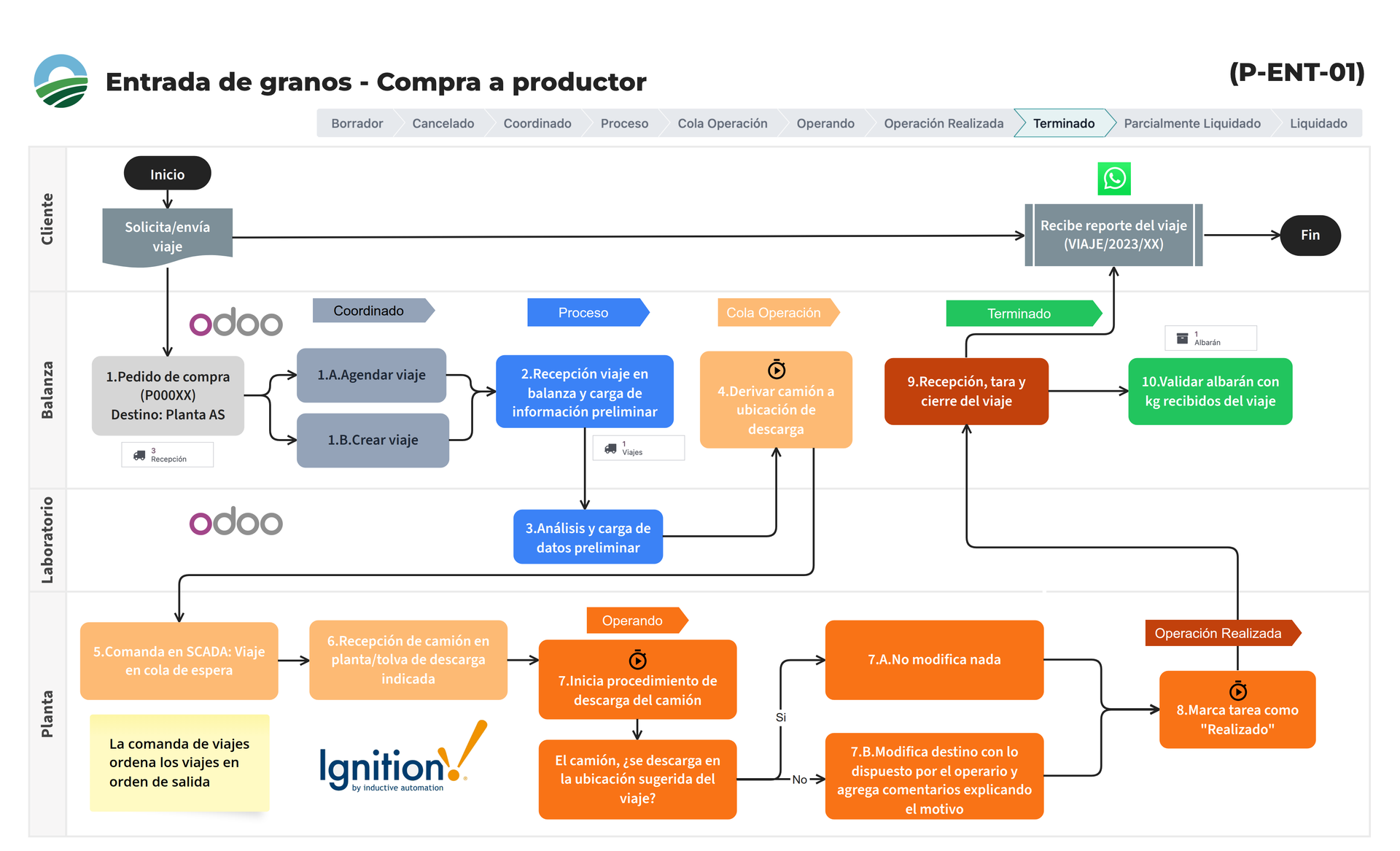 El procedimiento está mapeado en cuatro carriles de responsabilidad: Cliente, Balanza, Laboratorio y Planta. Cada paso del flujo dispara un cambio de estado en el sistema, lo que permite medir tiempos, identificar demoras y mantener trazabilidad de cada viaje.